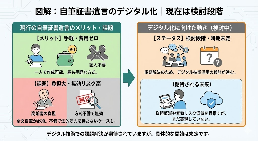 また、方式の不備により無効となるケースも多く、せっかく作成した遺言書が法的効力を持たないという問題も指摘されています。こうした背景から、デジタル技術を活用した新たな方式の導入に向けた検討が進められています。